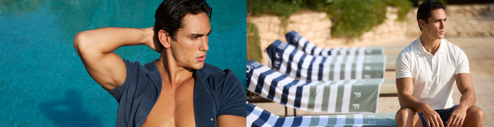 Luxurious, soft and breathable fabrics such as organic cotton, linen and terry are used to upgrade chic menswear holiday classics from the past.
